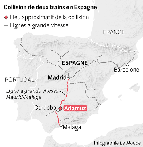 En raison de l’accident, « le trafic de trains à grande vitesse entre Madrid et Cordoue, Séville, Malaga et Huelva [des villes du sud de l’Espagne] sera interrompu au moins durant la journée du lundi 19 janvier », a fait savoir sur X le gestionnaire du réseau ferroviaire espagnol (ADIF).