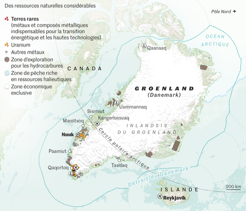 Territoire autonome du Danemark grand comme quatre fois la France hexagonale mais recouvert à 81 % de glace, le Groenland fascine pour ses hypothétiques ressources minières et son importance géostratégique, qui font l’objet de la convoitise persistante du président américain, Donald Trump.